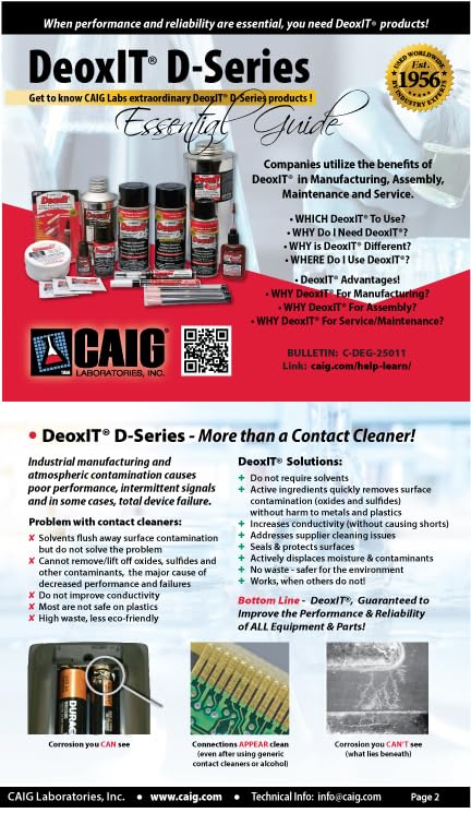 - Ideal for Gold Surfaces - Improves Conductivity and Maintains Optimum Signal Quality, Reduces Wear & Abrasion and Forms Protective Anti-tarnishing Coating Prevents Fretting/Dendrite Corrosion – Seals and Protects Base Metals - Stabilizes Connections Between Similar and Dissimilar Metals - Reduces Arcing, RFI and Intermittent Connections Ideal for applications in all industries.