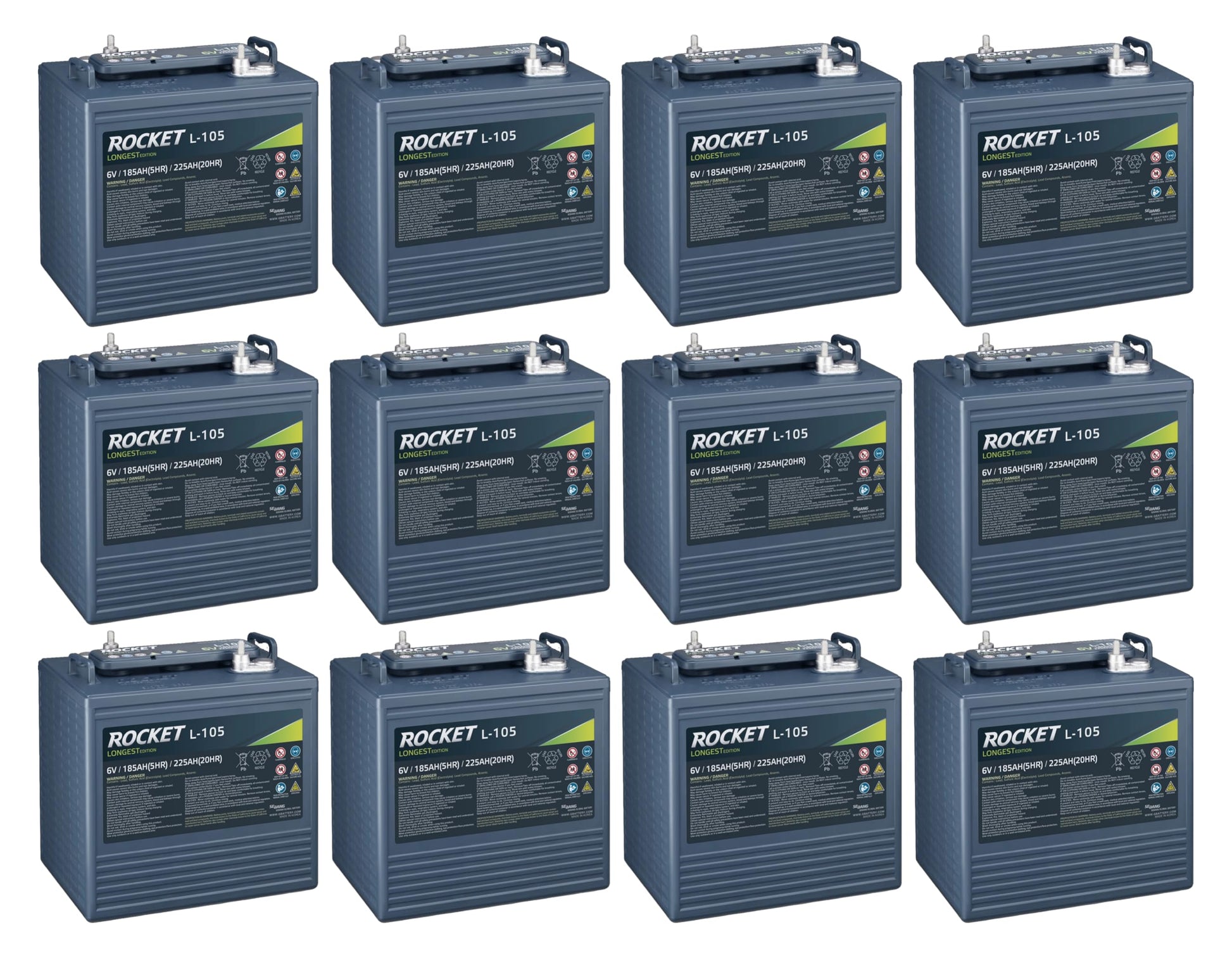 Rocket L-105 225Ah 6V Golf Cart Battery - Replaces T-105 / T-605 (Set of 12)