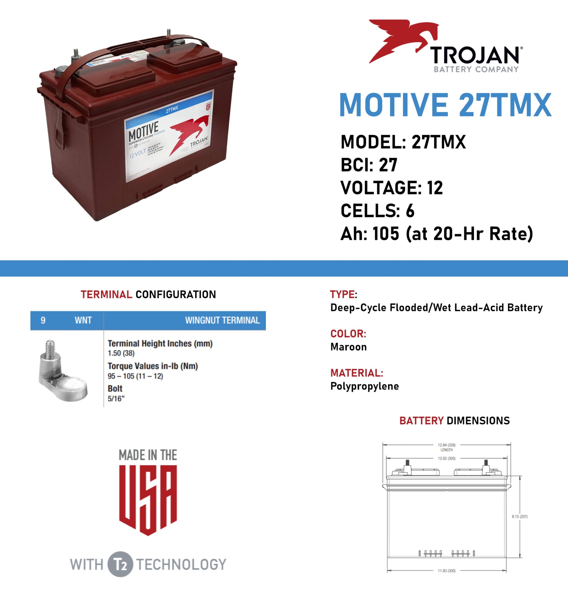 - SET OF 2 BATTERIES – Includes (2) Trojan 27TMX batteries. Dimensions (each): 12.05" x 6.62" x 8.15". Weight: 56 lbs. Ideal for dual bank setups and high-capacity needs.