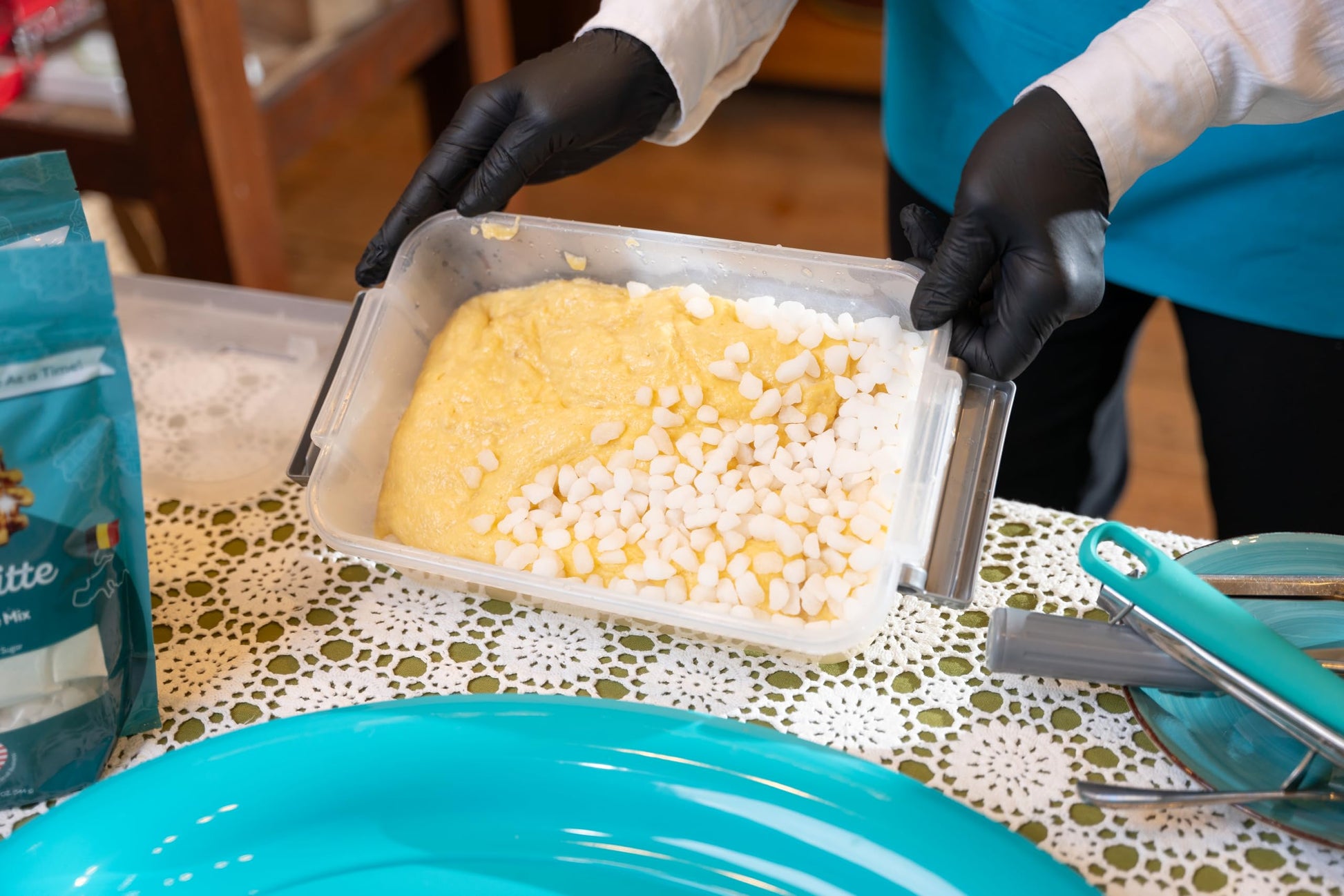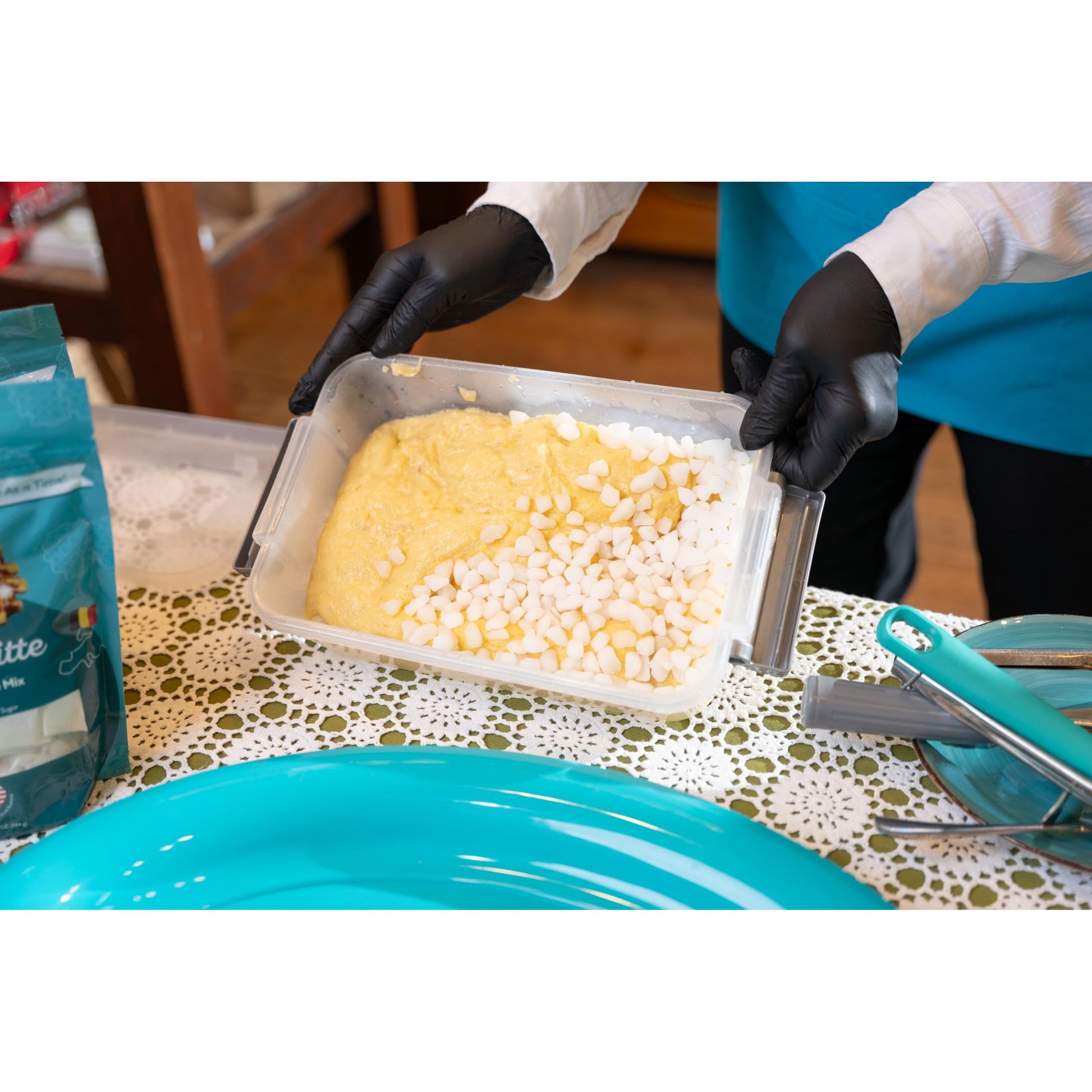 - Simple Prep – Just Add Eggs, Butter & Water – Includes yeast pouch inside. Mix, rise, stir in the sugar pearls, and cook! Makes waffles that are soft and chewy inside, crisp on the outside.